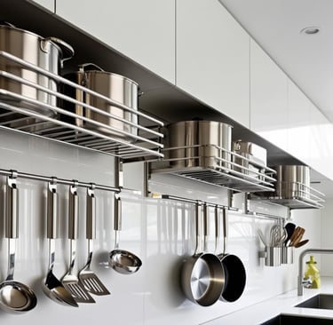 Wall-Mounted Racks: Hang pots, pans, and utensils to free up cabinet space.